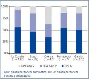 En octubre de 2010 estaban registrados en Galicia 275 pacientes en programas de DP, el 50 % de ellos realizaban DPCA, el 35% DPA con bajo volumen y el 15% DPA con alto volumen, con amplias variaciones provinciales (figura 1). El 49% utilizaba suplemento con poliglucosa y el 64% usaba dializado con bicarbonato (figura 2).