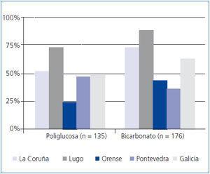 Figura 2. Utilización de poliglucosa y bicarbonato en Galicia, y distribución provincial.
