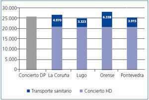 Los costes de trasporte sanitario para HD oscilaron entre 3.323 € en la provincia de Lugo y 6.338 € en la de Orense. Su influencia en los costes globales del tratamiento puede observarse en la figura 3.