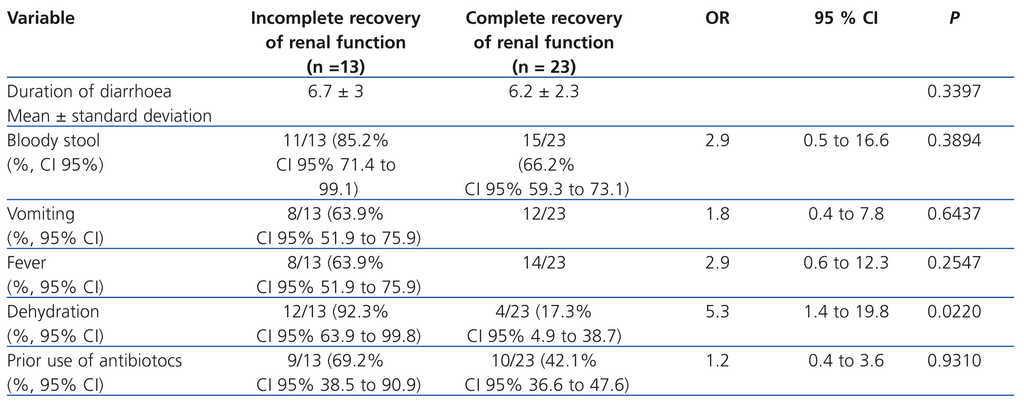 The comparison using the bivariate model, which included the following clinical variables assessed prior to hospitalisation: duration of diarrhoea, bloody diarrhoea, fever, vomiting, dehydration, and use of antibiotics, revealed that only dehydration was significantly correlated with a lack of complete recovery of renal function during the follow-up period (Table 2).