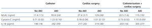 In both the catheter and cardiac surgery groups, we observed a significant difference between patients with and without AKI (P<.05). This significant difference was greater when we analysed all values together (P<.001).