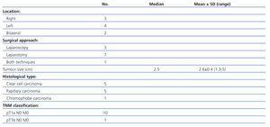 Tumour characteristics are shown in Table 2. Radical nephrectomy was performed in all cases: seven by laparotomy (the earliest cases when laparoscopy had not yet been incorporated into our hospital) and three by laparoscopic approach. Conversion to open surgery was necessary for one patient due to complications in the laparoscopic surgery. The average tumour size was 2.6±0.45cm (range: 1.3 to 5). All tumours, except one, were less than 3.5cm in diameter. All cases of RCC were diagnosed in stage T1N0M0. The Fuhrman nuclear grade was II in the five clear cell carcinomas.