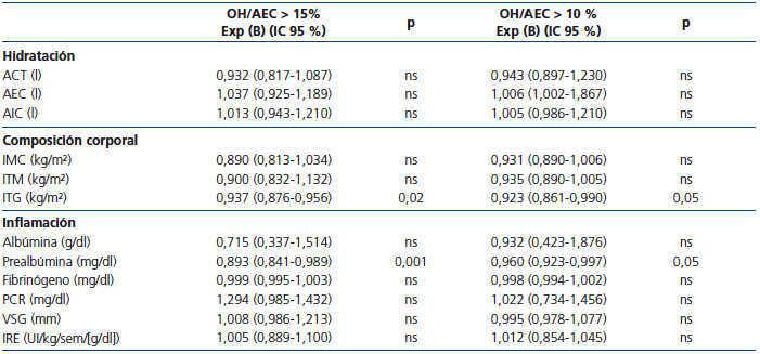 En ambos casos se encontró una asociación entre hiperhidratación y bajo ITG y de prealbúmina, como se muestra en la tabla 2. Esta asociación no se demostró con la OH media (OH/AEC = 7,5 %).