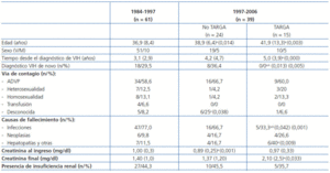 Los fallecidos han sido agrupados de forma temporal según el año de defunción: 61 (grupo I) fallecidos antes de 1997 (era pre-TARGA) y 39 fallecidos después de 1997. En este último período, los pacientes fueron a su vez clasificados según hubieran recibido o no TARGA: 24 sin TARGA (grupo II) y 15 con TARGA (grupo III), en función de la disponibilidad de dicho tratamiento en esos años.