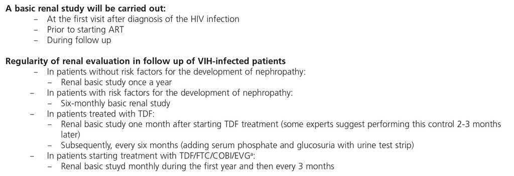 4. In patients treated with the coformulation of tenofovir, emtricitabine, cobicistat and elvitegravir (TDF/FTC/COBI/EVG, Stribild®), the summary of characteristics of the European Medicines Agency recommends monthly tests during the first year and subsequently every 3 months. Quality of the evidence: High. Degree of recommendation: Strong.