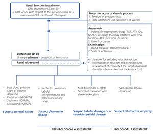 Renal function deterioration may occur in its acute form (acute renal failure) or gradually, in which case we speak in terms of progression. To evaluate progression, both GFR and proteinuria (or albuminuria) values must be considered, since both markers are related to progression to more advanced CKD stages. Following renal failure diagnosis, the aetiological diagnosis must be carried out, assessing whether the cause is prerenal, parenchymal or obstructive by an adequate anamnesis and physical examination, determination of uPCR, a study of the urinary sediment (detection of hematuria, leukocyturia, cylindruria) and a renal ultrasound study. Figure 2 displays an algorithm to be followed when there is renal function deterioration.