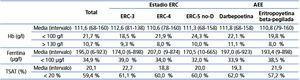 Tabla 1. Valores de hemoglobina, ferritina e índice de saturación de transferrina según el estadio de función renal y el tipo de agente estimulante de la eritropoyesis utilizado.