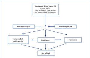 Figura 1. Potencial interacción entre factores de riesgo, comorbilidad y mortalidad tras el trasplante renal
