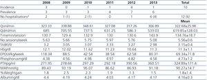 In terms of morbidity, we had two hospitalisations in 2008, one in 2009, two in 2010, none in 2011, one in 2012 and six in 2013 (we should point out that half of the hospitalisations were scheduled). The reasons for admission were: three cardiovascular, two infectious (associated with vascular access, in 2008 and 2010), one neoplasia, one digestive, two due to vascular access of non-infectious cause (insertion of tunnelled catheter and closure of fistula aneurysm) and three due to other causes (scheduled nephrectomy, herniorrhaphy and clinical deterioration).
