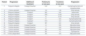 During the follow-up, at six months we found that 7 patients (53.8%) continued with nephrotic range proteinuria, 2 maintained non-nephrotic range proteinuria and in 4 patients, proteinuria had disappeared. However, at the end of the follow-up, 7 patients were classified as having NS with frequent relapses (53.8%), five were cortico-resistant (38.5%) and one was cortico-dependent (7.7%).
