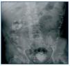 Figura 2. Radiografía simple de abdomen sin contraste que muestra múltiples opacidades centriméticas de distribución irregular en la periferia del marco cólico, que reflejan depósito de lantano en los divertículos.