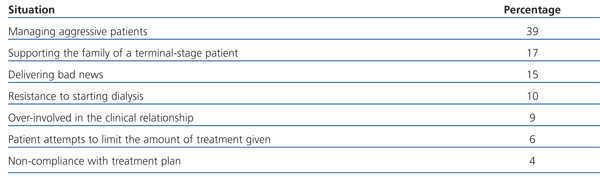 The health care professionals evaluated in our study indicated that the most difficult situations that they face in normal clinical practice are those that have to do with communication with patients (for example, dealing with an aggressive patient, resistance to dialysis, etc.) and the family (for example, giving support to the family of a terminal-stage patient). In previous studies42 carried out with similar study subjects, the most feared situations were communicating with patients (51.7%) and their families (39.3%).