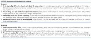 A 12-hour interdisciplinary course was organised on 5 separate occasions during 2007. The course was divided into two sessions that were held on two consecutive days during mornings or afternoons. The hospital department for continued training collaborated directly with the design and execution of the course. We also procured that all hospital staff were released for training sessions without having to make up for missed time. This was done in such a manner as to include the greatest possible number of participants without causing notable losses in productivity. At the start of each course, we asked all participants to list their three most feared situations, or those that produced the greatest amount of difficulty from an emotional standpoint. The main situations that were identified by the study group are listed in Table 2 (there was no need to categorise them).