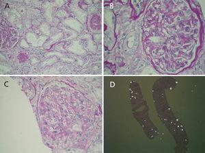 En enero de 2010 ingresó por insuficiencia renal aguda con creatinina plasmática de 9,6 mg/dl en un contexto de vómitos y aumento del débito por el drenaje. El sodio en orina era de 34 meq/l. En las exploraciones complementarias también destacaba la presencia de una proteinuria de 0,6 g/24 h y un sedimento de orina con 10 hematíes por campo sin leucocituria. En orina se observó una beta-2-microglobulina de 548,72 µg/g y NAG de 9 U/l. Ante la persistencia del deterioro de la función renal a pesar de reposición de la volemia se decidió realizar una biopsia renal para filiar origen de insuficiencia renal aguda.