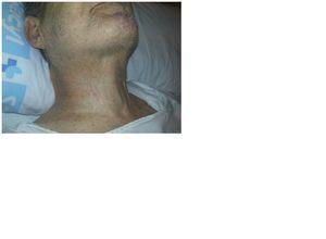 Iodide mumps are characterised by a rapid and painless growth of the salivary glands following iodine contrast administration. It can present itself several minutes after exposure and up to 5 days later. Its incidence is unknown, with few reported cases: 40 until 2012.2 It was described for the first time in 1956 by Sussman and Miller.3 It is believed to be caused by iodine contrast, as an idiosyncratic reaction or due to its toxic accumulation which causes inflammation, oedema of mucous membranes and duct obstruction due to the concentration through the sodium iodide symporter of salivary gland tissue. 98% of iodine is excreted by the kidney and the remaining 2% by the salivary, sweat and lacrimal glands. As a result, CKD could be a risk factor for its development.4 It can recur with successive exposures to iodine contrast.