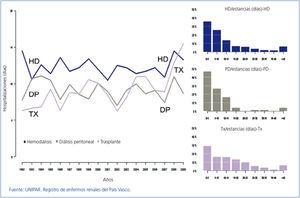 Otro factor insuficientemente analizado es el de los costes de hospitalización. Según se observa en el registro del País Vasco, único que publica desde hace 15 años dicho dato en nuestro país, la DP domiciliaria tiene siempre, en todo el histórico recogido, menos días de ingreso por paciente y año que la HD (Figura 3). Y también, en los últimos años, menos días de ingreso que los pacientes trasplantados. Mientras que las estancias de pacientes en HD y DP se mantienen constantes, con una diferencia de 3 a 4 días entre ambas técnicas, los días de ingreso de los paciente trasplantados muestran una tendencia creciente, probablemente derivada del aumento de edad de este grupo.