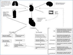 En un modelo experimental de FRA por lesión de isquemia/reperfusión (LIR), Rabb et al.53 mostraron una supresión significativa de la expresión de receptores de canales de sodio pulmonares, Na-K-ATPasa y acuaporina en el FRA en comparación con controles. En un modelo similar de LIR, Kramer et al.52 encontraron que el FRA se asocia con un aumento de la permeabilidad vascular pulmonar dentro de 24 horas de la lesión, lo que correlaciona con los cambios en la función renal. Ambos estudios tienen importantes implicaciones en cómo puede incidir o exacerbar el FRA la lesión pulmonar aguda, contribuyendo a la acumulación de agua extravascular pulmonar (además de la fluidoterapia en el manejo del FRA). En un pequeño estudio de cohortes en pacientes sépticos críticamente enfermos con FRA, Van Biesen et al.54 mostraron que, en los pacientes con una hemodinámica aparentemente óptima, la restauración del volumen intravascular y una alta tasa de uso de diuréticos fracasó tras la fluidoterapia en mejorar la función renal, y condujo a un innecesario acúmulo de fluido y a un empeoramiento del intercambio gaseoso. El acúmulo de fluido y la sobrecarga pueden también afectar a la función renal empeorando el FRA. Por ejemplo, la sobrecarga de líquidos puede contribuir o empeorar la hipertensión intrabdominal, en particular en pacientes gravemente enfermos con traumatismos o en pacientes quemados, conduciendo a nuevas reducciones en el flujo sanguíneo renal, el retorno venoso, la presión de perfusión renal y la diuresis55. La ventilación mecánica y la presión final espiratoria positiva, al aumentar la presión intratorácica, pueden alterar la función renal y contribuir a la acumulación de fluido mediante el estímulo de una matriz de respuestas hemodinámicas, neuronales y hormonales que actúan sobre el riñón para reducir su perfusión, la TFG e inhibir la función excretora56,57. Asimismo, la lesión por ventilación mecánica (barotrauma, biotrauma, volutrauma, atelectrauma) puede inducir a las células tubulares renales a la apoptosis y FRA58. Por último, el balance positivo de líquido en los pacientes de riesgo puede precipitar reducciones agudas en la función cardíaca y exacerbar la IC59.