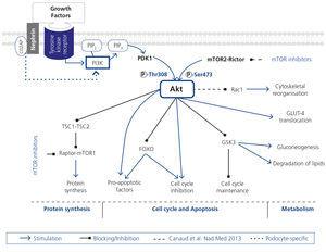 Canaud et al. have recently published the results of a study in which they demonstrate, using experimental in vivo, in vitro models and human biopsies, Akt2 activation as a protective mechanism in the podocyte against a reduction of kidney mass9. The loss of Akt2 or the decrease in one of the phosphorylations required for its activity [pAkt (Ser473)] worsens podocyte injury, causing proteinuria. A failure in its phosphorylation, blocking the mTOR2 complex by sirolimus, could explain, at least in part, the undesirable effects of this drug group observed in some transplant patients.
