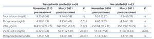 Of the 36 patients receiving treatment, 9 received cinacalcet in November, and this number increased to 11 in March. Eleven patients received active vitamin D treatment both in November and March.