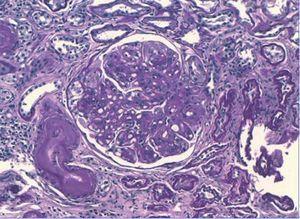 Se inició tratamiento depletivo con diuréticos, inhibidores de la enzima de conversión de la angiotensina (IECA) y antagonistas de los receptores de angiotensina II (ARAII), estatinas, heparina de bajo peso molecular, y se recomendó mejorar el control glucémico. Debido a la hidronefrosis del riñón izquierdo provocada por un síndrome de la unión pieloureteral se realizó pieloplastia y se colocó una nefrostomía percutánea en el riñón izquierdo. A pesar de estas medidas el paciente requirió nuevos ingresos hospitalarios por descompensación del síndrome nefrótico, con incremento de la creatinina plasmática a 2,5-3 mg/dl y persistencia de la proteinuria nefrótica, motivo por el que se decide iniciar programa de hemodiálisis. Aunque la sospecha inicial fue de ND, estando el paciente en hemodiálisis persistió el mal control volumétrico y con parámetros bioquímicos de actividad del síndrome nefrótico decidimos realizar una biopsia renal para descartar una glomerulopatía asociada. Los hallazgos de biopsia fueron: 12 glomérulos por plano de corte, cinco de ellos completamente esclerosados. Todos los glomérulos estudiados mostraban una expansión mesangial con formación de nódulos acelulares (Kinmelstein-Wilson). La inmunofluorescencia fue negativa. En el intersticio se observó una fibrosis moderada con focos de atrofia tubular asociada. El componente vascular mostró una llamativa hialinosis de su pared, siendo el diagnostico anatomopatológico final compatible con una glomeruloesclerosis difusa (figura 1) y nodular (figura 2), con sustrato morfológico de enfermedad diabética.