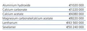 If we calculate the maximum number of tablets a patient may consume per day, the cost of treatment with aluminium hydroxide (prescribed exclusively for rescue treatment in a patient with uncontrolled hyperphosphataemia during limited time periods) amounts to €51 per year. Other treatment costs would be as follows: calcium carbonate, €61/year; calcium acetate, €219/year; magnesium carbonate/calcium acetate, €411/year; lanthanum carbonate, €2178/year; and sevelamer, €2512/year.