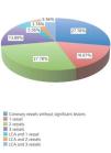 The distribution of coronary vessels with significant damage (>50% in proximal LAD and LCA; >70% in all other segments) is shown in Figure 1. Of the 36 patients in the study, 26 (72.2%) had significant CAD in one or more vessels. According to the number of vessels, we found that: LCA disease and 1 vessel in 2 patients (5.6%), LCA and 2 vessels in 1 patient (2.8%), and LCA and 3 vessels in 2 patients (5.6%). Coronary disease different from LCA (LAD, RCA, CX) were as follows: disease in 1 vessel in 6 patients (16.7%), 2 vessels in 10 patients (27.8%), and 3 vessels in 5 patients (13.9%). The distribution of significant lesions by coronary artery was as follows: significant LAD disease in 23 patients (63.9%), CX in 18 patients (50%), and RCA in 10 patients (27.8%). Mean ventricular ejection fraction (by ventriculography) was 50.28%±12.12% (range: 20-65), and ventricular dysfunction was distributed in the following manner: no ventricular dysfunction: 20 patients (55.6%); mild dysfunction: 8 patients (22.2%), moderate dysfunction: 3 patients (8.3%); and severe dysfunction: 5 patients (13.9%).