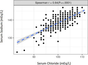 The median Cl− level was 101mEq/L (q25–q75: 99–103) while the median Na+ level was 139mEq/L (q25–q75: 137–141). Both natremia and chloremia had no significant differences when compared by sex, vascular access, or etiology. There was a strong, positive, and significant correlation between Cl− and Na+ (r=0.64) (p≤0.0001) (Fig. S1).