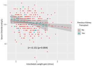 The correlation between Cl− and diuretic dose was low (r=−0.05) and not significant (p=0.49) but there was an inverse correlation between Cl− and interdialytic weight gain (r=−0.15) (p=0.004) (Fig. S2).