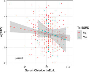The median value of both Cl− and Na+ were significantly lower in the group with “high” inflammation and there was a significant inverse correlation between Cl− or Na+ levels and Ln(CRP). This association was not affected by interdialytic weight gain, diuretic dose, or their previous transplant condition (Fig. S3) (Table 2).