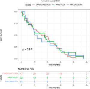 Cl− and mortalityDuring a median follow-up of 20 months (q25–q75: 10–32), 83 (22.2%) of the 375 patients died. The causes of death were: 47 (56.6%) cardiovascular, 22 (26.5%) infection and 14 (16.9%) malignancies. Although it appears that death due to infectious causes and malignancy occurs earlier (12 months), the log-rank test was not significant (p=0.87) (Fig. S4). There was no significant difference between Cl− and Na+ values according to cause of death (Table S1).
