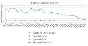 Figure 1. Creatinine values over time after renal transplant and days in which plasmapheresis (days 13, 15, 17, 19, 21), haemodialysis (days 0, 2, 4, 6, 7, 8, 11, 16) and exchange transfusion (day 9) were received