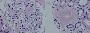 Figura 2. Técnica de hematoxilina-eosina en la que se observan nódulos amorfos en glomérulos y vasos.