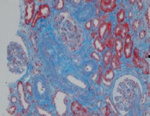 Figura 3. Tricrómico de Masson en el que se observa una intensa fibrosis.