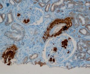 Figura 4. Estudio de inmunohistoquímica con depósitos de la proteína AA en vasos y glomérulos.