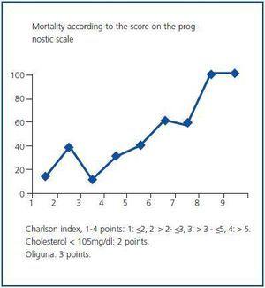 With the above data, we created a mortality prediction model and assigned the following values according to the OR: CCI, 1 to 4 points according to the quartile the patient belonged to: (1: ≤2, 2: >2- ≤3, 3: >3- ≤5, 4: >5); the presence of oliguria, 3 points; and cholesterol lower than 105mg/dl, 2 points. By thismethod, we obtained values from 1 to 9 for all cases. This scale was used to elaborate the prognostic curve shown in figure 1.