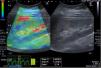 A case of focal necrotizing GN with small vessel vasculitis with marked interstitial fibrosis (55%). The greyscale ultrasonography image showing marked increased parenchymal echogenicity with relatively poor cortico-medullary differentiation, the left one showing color-coded US – elastography image showing mainly blue-green scale and the sinusoidal wave of compression and decompression seen in inferior aspect of image. The circles indicate the region of interests (ROIs). The upper ROI is on the parenchyma and the lower ROI is on renal fat sinus. The radial line on the sinusoidal wave indicates the end measurement (SI=3.17).