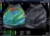 A case of acute interstitial nephritis post chemotherapy with mild interstitial fibrosis (10%). The greyscale ultrasonography image showing mild increased parenchymal echogenicity with preserved cortico-medullary differentiation, the left one showing color-coded US – elastography image showing mainly green-red scale and the sinusoidal wave of compression and decompression seen in inferior aspect of image. The circles indicate the region of interests (ROIs). The upper ROI is on the parenchyma and the lower ROI is on renal fat sinus. The radial line on the sinusoidal wave indicates the end measurement (SI=0.74).