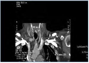 Se decide suspender la heparina ante la sospecha de TIH II, transcurriendo las sesiones sucesivas con múltiples problemas de flujos y resistencias del catéter, aparte de coagulaciones repetidas del circuito. A la espera de tratamiento con argatroban, se recambia el catéter yugular tunelizado por otro de similares características, sin mejorar el rendimiento, por lo que se realiza tomografía axial computarizada cervical, informando como trombosis parcial de la vena yugular izquierda (figura 2 y figura 3). Dos días más tarde el paciente acude asintomático a la unidad, pero a los 10 minutos de su conexión experimenta un nuevo episodio de disnea súbita con p02 de 78 %, de la que se recupera con medidas de soporte habituales en el transcurso de 1 hora, no precisando ingreso hospitalario. El recuento de plaquetas es de 101 x 109/l, inferior al de los días previos. Cuarenta y ocho horas más tarde las plaquetas son 162 x 109/l. Finalmente se consigue disponer de argatroban, que se administra a la dosis descrita previamente de 2590 mic/kg en bolo al iniciar la sesión y en perfusión posterior de 2 mic/kg/min, finalizando 1 hora antes de la desconexión. Los controles de : tiempo de tromboplastina parcial activada (TTPA) se mantuvieron en los márgenes recomendados de 1,5 a 2,5 sobre el basal. A partir de ahí desaparecieron las coagulaciones del circuito y el rendimiento del mismo catéter fue excelente. Durante la espera al inicio del tratamiento con el inhibidor de trombina, así como después hasta que el paciente finalmente inició diálisis peritoneal, se prescribió tratamiento antiagregante con clopidogrel. Se explica por la amenaza de nuevas punciones de vasos centrales y dos intervenciones quirúrgicas pendientes: catéter peritoneal y resección transuretral de pequeño tumor vesical, si bien esta última se realizó ya iniciada la diálisis peritoneal. En ningún momento antes de su transferencia al centro de referencia para el cambio de la terapia sustitutiva se administraron conjuntamente argatroban y dicumarínicos. Hay que señalar la ausencia de datos de trombosis venosa aguda y que la frecuencia cardíaca estaba controlada.