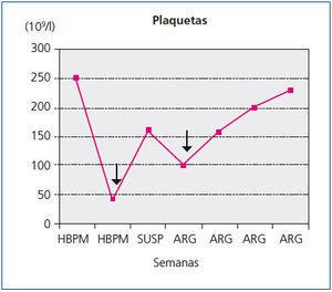 Tres días antes de la primera sesión de diálisis se inicia la administración de heparina de bajo peso molecular en sustitución de su anticoagulante habitual. Se inserta catéter tunelizado yugular izquierdo, recibiendo dosis habituales de heparina para prevenir la coagulación del circuito y de heparina no fraccionada para sellado del catéter. El recuento plaquetario es de 210 x 109/l. Las primeras sesiones son poco satisfactorias por bajos rendimientos del catéter. Nueve días tras la primera administración de heparina, en su cuarta sesión de diálisis, asistimos a un primer evento agudo: disnea súbita y dolor precordial al inicio de la sesión sin hipotensión, hemoptisis ni fiebre. Tensión arterial: 180/100 mmHg, taquipnea, sin fiebre, ingurgitación yugular ni cianosis, y con frecuencia cardíaca de 90 por minutos, con soplo sistólico eyectivo II/VI, sin extratonos ni roce pericárdico, broncoespasmo sin crepitantes, no edemas ni signos de trombosis venosa profunda, con coloración y temperatura pedia normales. No rash cutáneo. Hemoglobina: 9,6 g/dl, leucocitos: 7200. Plaquetas: 44 x 109/l (figura 1), láctico deshidrogenasa (LDH): 510 U/l, troponina 1 cardíaca (cTnI): 2,6 ng/ml. Sin signos de isquemia o lesión en el electrocardiograma. El paciente permanece en observación 24 horas con normalización clínica (ya durante el transcurso de la sesión) y con descenso significativo de la cifra de cTnI a 1,2 ng/ml. La radiología no aportó datos de interés.