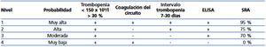 Tabla 2. Probabilidad diagnóstica en trombopenia inducida por heparina en hemodiálisis (tres factores clínicos y ELISA)7