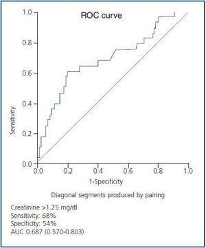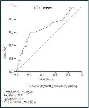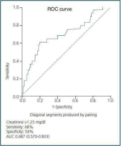 By ROC curves, we found that the cut-off point which showed the best diagnostic accuracy for digitalis overdose in women was MDRD ≤ 52ml/min/1.73m2 (sensitivity 76%, specificity 60%, AUC 0.702; 0.727-0.777), or creatinine > 1.05 mg/dl (sensitivity 76%, specificity 56%, AUC 0.694; CI 95% 0.618-0.771), (figures 1 and 2). In men, the cut-off point was MDRD ≤ 56ml/min/1.73m2 (sensitivity 68%, specificity 59% AUC 0.687; 0.570- 0.804), or creatinine > 1.25mg/dl (sensitivity 68%, specificity 54%, AUC 0.687; CI 95% 0.570-0.803), (figures 3 and 4). Using this cut-off point from the MDRD formula, 29% of the overdosed women showed lower MDRD values compared with 12% of those with normal MDRD and the difference was significant (p = 0.046). With the men, 23% showed lower MDRD values compared with 10% with normal MDRD and the difference was significant (p = 0.0013), (table 2).