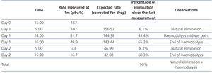 The dose rate at a distance of one metre upon discharge was 16.7µSv/h in case 1 (with two haemodialysis sessions) and 1.4µSv/h in case 2 (with three sessions). These figures are similar to those found by other authors, such as Murcutt et al.18, who also carried out haemodialysis sessions, with less than 20µSv, and Andrés et al.14, with 18µSv after two sessions. Only Gutiérrez et al.19 obtained figures of 1.4µSv on discharge, after two sessions, as with case 2 described, although the latter required three sessions.