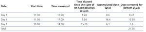 In the two cases that we reported, there is a major difference in the radioactive dose received by the haemodialysis nurse (21.55µSv/h in case 1 and 145.55µSv/h in case 2), for three reasons. Firstly, in case 1, the process of setting up the monitor and preparing the material was carried out with the patient sitting on a chair behind a lead screen and further away, while in case 2, the patient was in the bed due to her mobility problems. Secondly, in case 1, vascular access was performed with an arteriovenous fistula, while in case 2, a catheter was used, which involves a longer handling period. Thirdly, the second patient’s session was poorly tolerated and required more interventions during the haemodialysis technique than in case 1, due to bacteraemia.