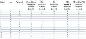 Inclusion criteria were: nephrotic syndrome with primary FSGS, negative pregnancy test, and approved medical consent. The exclusion criteria were: creatinine clearance (CCr) <60ml/min/1.73m2, gastric or duodenal ulcers, active tumours and/or infections with or without specific treatment, diabetes, morbid obesity, vesicoureteral reflux, single kidney, or intravenous drug abuse. Finally, the criteria for interrupting treatment were a reduction in CCr>30% from initial levels for a period >3 months, leukopenia (leukocyte count <3000/mm3), refractory anaemia, active infection, persistent gastrointestinal intolerance, or lack of response in proteinuria reduction, <50% from initial values, after 6 months of treatment.