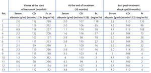 The 13 patients completed the 12 month treatment protocol, including the 4 that remained within the nephrotic range, since they still underwent a reduction in proteinuria >50% as compared to initial values. Of the 9 patients that responded to treatment, 8 had varying values of proteinuria, but had no relapses by the last check-up performed after 26 months. The 4 unresponsive patients remain within the nephrotic syndrome and have normal glomerular filtration rates (Table 4).