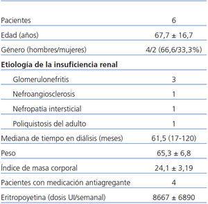 En cuanto a los criterios de inclusión, debían ser mayores de 18 años, con estabilidad hemodinámica y una esperanza de vida mayor que el tiempo previsto de realización del estudio. Se les realizaba una pauta de diálisis de tres veces por semana, y presentaban niveles de albúmina sérica superiores a 3 g/dl y hematocrito > 30%. Se establecieron como criterios de exclusión la enfermedad inflamatoria o infecciosa sistémica en fase activa, la enfermedad neoplásica no curada y los pacientes con trastornos de la hemostasia o tratamiento anticoagulante oral en el momento del estudio. Ningún paciente podía recibir la transfusión de hemoderivados en la semana previa al estudio, durante y la semana posterior.