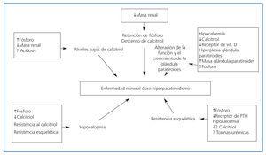 Fisiopatología: Las diferentes alteraciones metabólicas son secundarias a la pérdida progresiva de masa renal y función renal, que conlleva una retención de fósforo y descenso de los niveles de calcitriol que son responsables de la resistencia esquelética a la acción de la PTH