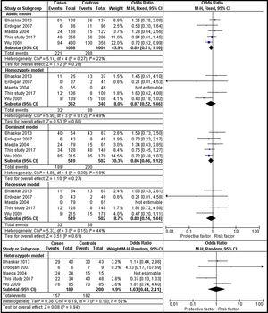 | Recessive | GG vs CC+CG | – | – | – | 3.72 | 1.17–6.34 | 5.60 | 0.169 |