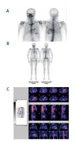 El estudio del paciente incluye, entre otras pruebas, gammagrafía ósea con 99mTc-MDP (figuras 1a, 1b y c), obteniendo imágenes de rastreo corporal completo y SPECT torácico, radiografía de tórax (figura 2) y ecocardiograma (figura 3).