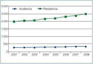 Durante los últimos ocho años de estudio, la incidencia creció un 19%, mientras que la prevalencia aumentó más de un 26% (figura 1).